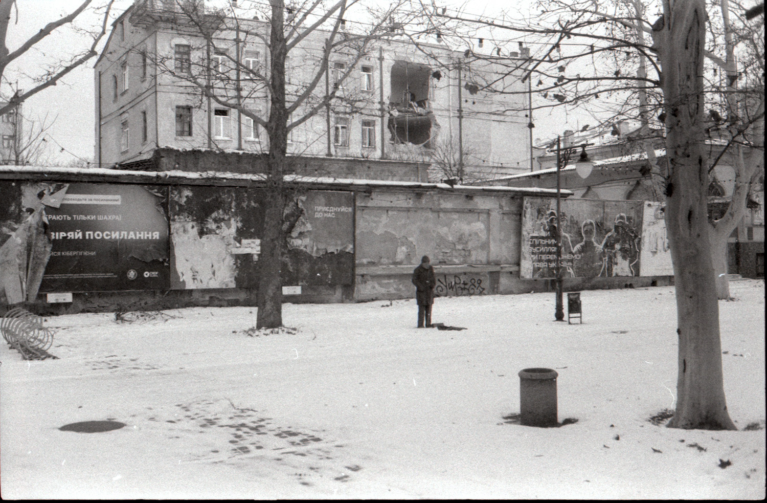 Kherson covered with snow — an unusual sight. This year, the city’s empty streets were full of drifts, but the snow remained white only for a brief moment: constant shelling, drone strikes, and fires quickly laid a layer of black soot and dust on everything. Kherson’s black snow. The eerie silence of the city center is broken only by the intense fire of Ukrainian howitzers—like giant drums—and the echoes of the enemy’s retaliatory strikes.